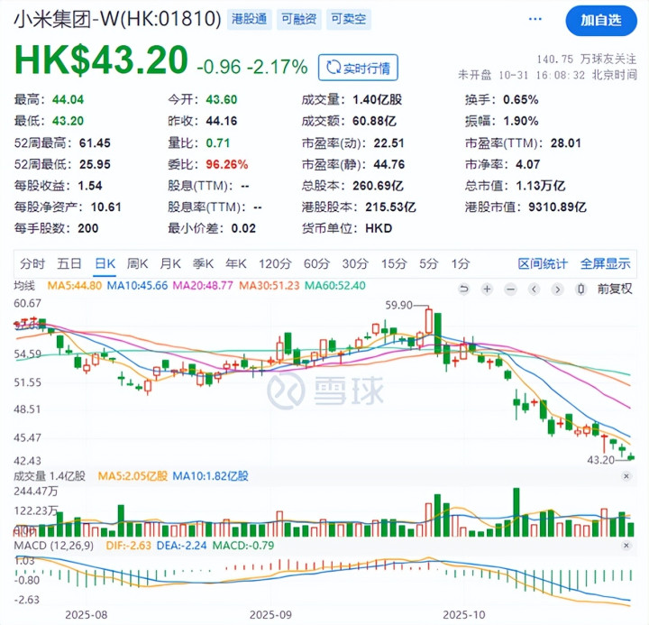 10月31日(上周五),港股小米集团股价下跌2.17%,收于43.20港元,市值1.13万亿港元。